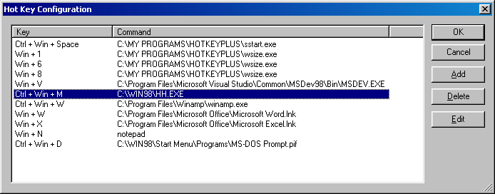 The Hot Key Configuration dialog, shown below, allows you to add, edit and delete hot keys.