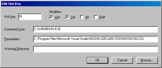 In most cases the Parameters and Working Directory edit boxes can be left empty. If set, the Parameters are passed to the application as part of the command line. The format and meaning of these Parameters depends on the application. Normal Windows shortcuts combine the command line and parameters into a single entry called Target. I’ve split these up because it was easier to program and also means that you avoid having to put quotes around an executable if the path has spaces in it. In Edit Key Dialog shown above, I’ve set the command line to hh.exe (the HTML help viewer) and the parameters to the full path of the Jan 2001 MSDN collection file. That way I can call up the MSDN library by pressing Ctrl+Win+M.