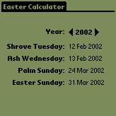 Palm Easter Calculator is a freeware program that calculates when Easter Sunday and other related dates fall for a given year. The program is unbelievably simple and was the very first program I wrote for the Palm (it was very much an exercise to get me up and running using the PalmOS and GCC tools). The code to calculate easter is based on the algorithm presented in The Calendar FAQ by Claus Tondering.
