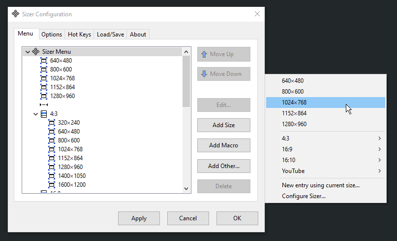 - Hot keys. Sizer actions, including bringing up the main resizing menu, can be assigned to a hot key that can be used at any time. e.g. by default pressing Ctrl+Win+Z brings up the Sizer context menu. This saves you hunting out the window border to right click it.
