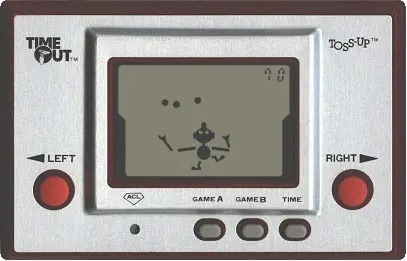 Toss Up came out in 1980 and was the first in the very successful Game & Watch series of games made by Nintendo. Toss Up was in fact distributed by a company called TimeOut. Nintendo also released the game themselves calling it Ball. The game was also distributed in Germany by yet another company using the moniker of Jolly Jongleur. There is also some speculation that the game was originally called Acrobat, since the model code is AC-01. I’ve stuck to using the name Toss Up because that’s how I remember it and is name used on the original game I own. Also, there’s already a Ball simulator available for Windows (see the G&W Simulators site), therefore using the name Toss Up avoids potential mix ups.